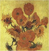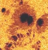 Темное пятно на солнечной поверхности, вызыванное концентрацией магнитного поля Солнца (рисунок слева). Они выглядят темными поскольку они холоднее чем плазма, окружающая его. Солнечные пятна появляются в группах на время от нескольких часов до нескольких месяцев. Количество солнечных пятен увеличивает и уменьшается в течении одиннадцати летнего цикла. Очередной пик пришелся на 2001 год. Ученые думают, что цикл солнечного пятна происходит миллионы лет и что на других звездах также имеются солнечные пятна. Справа приведена часть картины голландского художника Ван Гога "Подсолнухи". Между изображениями есть чудное сходство.