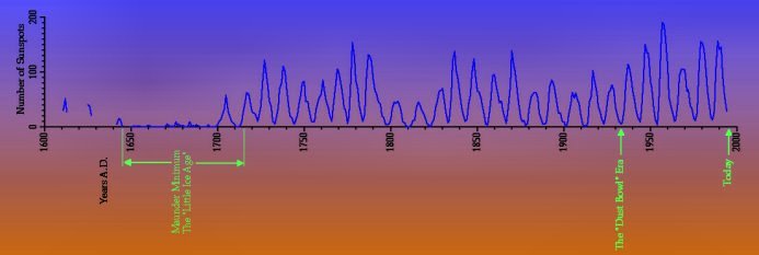Длился в течении семидесяти пяти годового периода, теперь называют минимумом Маундера (1645 – 1715), когда количество солнечных пятен резко уменьшилось и температура на земле упала достаточно низко, чтобы вызвать «маленький ледовый век» - суровую холодную погоду в северном полушарии земли. В течении 11 и 12 веков наблюдалось большое потепление, связанное с увеличенной солнечной активностью.