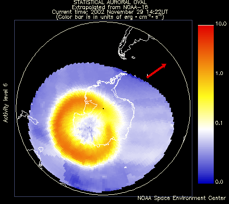Картина распределения аврорального излучения вокруг земных магнитных полюсов. Авроральный овал хорошо выделяется на период от едениц часов до нескольких дней в зависимости от геомагнитной активности. Авроральная зона занимает около 6 градусов по ширине и концентрируется на магнитной широте 67о