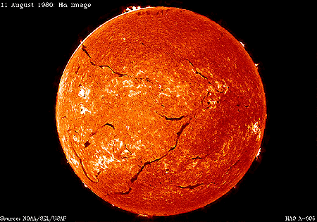 Свет, излучаемый на длине волны 6563А от переходов в водороде. Эта длина волны приходится на красную область видимого спектра и излучается в солнечной хромосфере. А вот так выглядит Солнце на этой длине Волны.