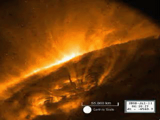 ![]() На представленном видео показано развитие одного из видов протуберанца на поверхности Солнца (движение материи). Видны расширяющиеся в размерах дуги, которые затем рвутся. Силовые линии магнитного поля определяют форму дуги. Размеры протуберанца очень велики. Для сравнения на видео представлен размер земли в виде белого круга. |