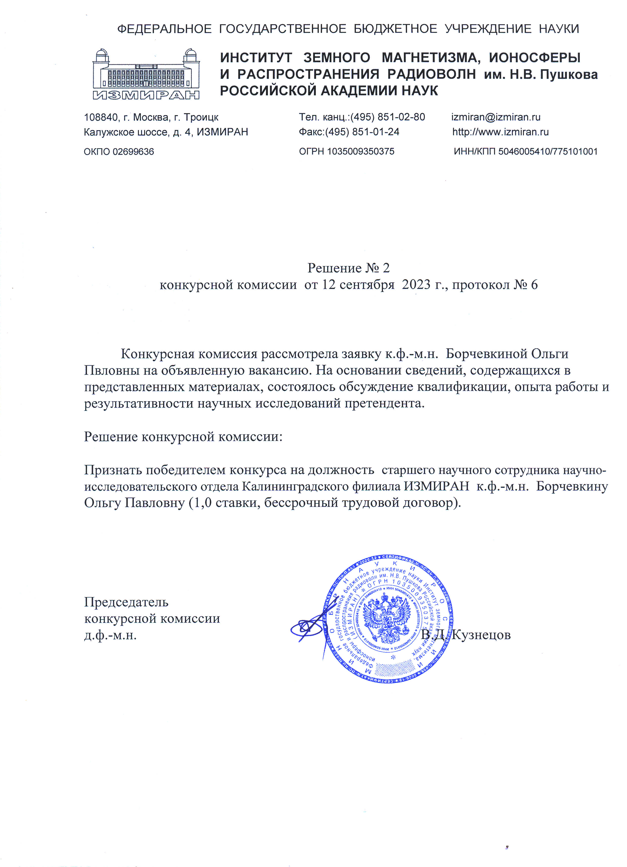 Федеральное государственное бюджетное учреждение науки Институт земного магнетизма, ионосферы и распространения радиоволн им. Н.В. Пушкова Российской академии наук (ИЗМИРАН) объявляет конкурс на замещение вакантной должности