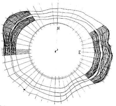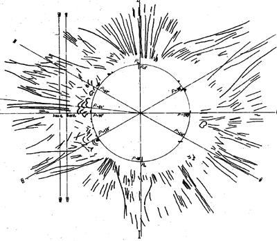 I. Метод изофот. Для изучения распределения отклонений плоскости поляризации по всей короне был применён метод поляризационных изофот, сущность которого заключается в следующем. Для получения резких изофот было изготовлено несколько последовательных контрастных копий. Изофоты спроектированы на экран и зарисованы в сводную в сводную диаграмму. Фрагмент диаграммы изображён на. Радиальные прямые соответствуют положению оси пропускания поляроида. Отклонения точек пересечения изофот от соответствующих радиальных прямых соответствуют отклонениям плоскости поляризации от радиального направления.