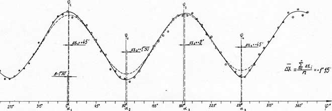 II. Измерения отклонений по сдвигу фаз. Метод измерения положения плоскости поляризации по сдвигу фаз заключается в нахождении фазы кривой изменения интенсивности в выбранной точке короны и сравнения её положения с положением фазы вращения поляроида.