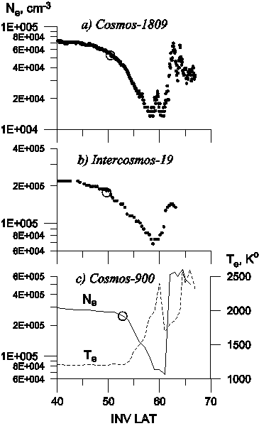 The large data set of Intercosmos-19 (~300 orbits), Cosmos-1809 (~100 orbits), and Cosmos-900 (~1200 orbits) data is used to analyze MIT characteristics. Data have been obtained both for high (F10.7 ~ 200, 1979-1980) and low (F10.7 ~ 70, 1986-1987) solar activity. They cover all longitudes in both hemispheres, the 1800-0600 LT time interval, and the magnetic activity range Kp = 0-8. Topside sounding data onboard the Intercosmos-19 and Cosmos-1809 satellites can be obtained within the entire range from the height of the F2 layer maximum to the height of the satellite. The Intercosmos-19 satellite had got an elliptical orbit with an altitude varying from 500 to 1000 km. As an example, the MIT registered by Intercosmos-19 at a height of 600 km at 0430 LT on September 30, 1980 (Kp = 2o) in the Northern Hemisphere is shown in Fig. 1b. The MIT polar wall is less pronounced then the equatorial wall; however, the trough is fairly deep and is easily observed. The Cosmos-1809 satellite had an almost circular orbit with a height of about 1000 km. Figure 1a shows the MIT registered onboard Cosmos-1809 at 1800 LT on January 10, 1989 (Kp = 3-) at a height of 1000 km in the Northern Hemisphere. Both walls of the trough are equally pronounced. The trough bottom has a complicated structure caused by the prehistory, which will also be discussed below. The Cosmos-900 satellite had a circular orbit. Its altitude decreased during the observations from ~500 to ~350 km. Figure 1c shows MIT registered by Cosmos-900 at 0055 LT on July 26, 1979 (Kp = 2-) at a height of about 375 km in the Southern Hemisphere, i.e., almost at a maximum of the nighttime F2 layer. A peak of Te usually accompanies a trough in Ne [Smilauer and Afonin, 1983]. As a rule, more pronounced troughs correspond to more distinct peaks in Te (e.g., see Fig. 1c). A Te peak is observed at latitudes of the trough bottom, but a Te maximum not always coincide with an Ne minimum (see also Fig. 1c).