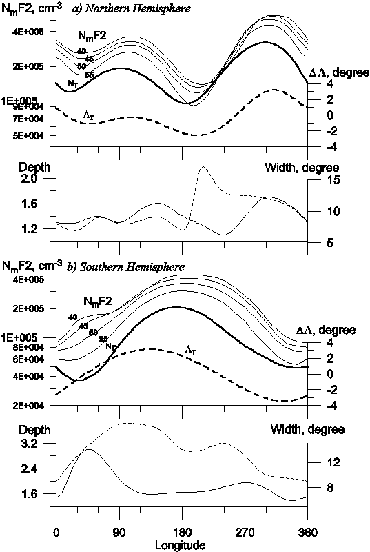 The amplitude of the NmF2 longitudinal variations in the Southern Hemisphere is larger then in the Northern Hemisphere and reaches ~5.5 at a trough minimum. At the same time, Fig. 2b shows that the minimum (3.7x104 cm-3) and maximum (2.1x105 cm-3) of NmF2 are observed at longitudes of 30o and 170-180o, respectively. The amplitude of the longitudinal effect on the trough location is also larger in the Southern Hemisphere then in the Northern Hemisphere (6o and 5o, respectively). The causes of LE on the trough location and form were qualitatively analyzed by Deminov and Karpachev [1986a] and Deminov and Karpachev [1986b], respectively. The causes of the NmF2 and hmF2 longitudinal variations in the trough region will be studied in detail on the basis of calculations in the next paper. So, omitting the causes of LE, we note here the main points. The position of a trough minimum and the plasma concentration in the trough are widely variable with longitude. The Ne longitudinal variations in the mid-latitude Northern Hemisphere are similar to the Ne variations at a trough minimum but differ in their phase and amplitude. In the Southern Hemisphere they are also considerably different in form. As a result, the trough shape varies with longitude.