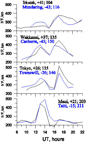 Рассматриваемое событие относится точно к равноденствию и поэтому идеально подходит для исследования (а)симметрии между северным и южным полушариями. Попытки такого анализа предпринимались и ранее, так, например, о высокой степени симметрии в скорости ПИВ во время бури 9 ноября 1979 г. сообщалось в работе [Hajkowicz, Hunsucker, 1987]. На рис.6 представлены четыре пары станций, расположенных в ночном (восточноазиатском) секторе на близких долготах и инвариантных широтах в северном (черные кривые) и южном (синие кривые) полушариях. Видно, что вариации высоты слоя F2 имеют подобный характер во всех случаях. Видно также, что для всех пар станций при прохождении первой ВГВ эффекты были немного сильнее в южном полушарии, а при прохождении второй ВГВ - в северном. Заметим, однако, что все станции северного полушария расположены на 8 - 15o западнее соответствующих станций южного полушария, т.е. примерно на 1 час раньше по местному времени, поэтому в первом случае они были дальше от полуночи, а во втором - ближе к полуночи. Таким образом, разница в амплитуде эффекта связана, в основном, с его зависимостью от местного времени. С учетом этой зависимости даже количественные соотношения между амплитудами первой и второй волны в северном и южном полушариях сохраняются.