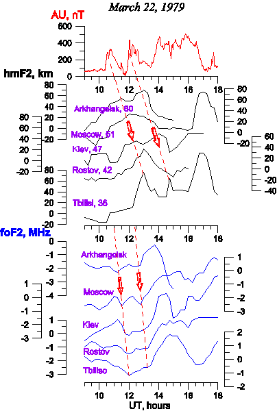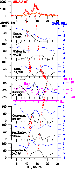 На рис.6 представлены вариации hmF2 (вверху) и foF2 (внизу) для станций европейского сектора (20-60oЕ). Первая суббуря в этом долготном секторе пришлась на послеполуденные часы (~13-16 LT), а вторая - на вечерние (~17-20 LT). Поэтому параметры суббурь на рис.6 представлены АU индексом, характеризующим восточный электроджет. Два первых, не очень сильных всплеска AU индекса, вызвали два довольно значительных подъема hmF2 (вверху) и два хотя и слабых, но четко фиксируемых на всех станциях уменьшения foF2 (внизу). Казалось бы, имеет место классическая картина, связанная с распространением ВГВ к экватору. Однако скорость распространения возмущения в foF2 гораздо выше, чем в hmF2, что хорошо видно по наклону штриховых прямых. Это связано с тем, что станции европейского сектор находились на краю восточного электроджета, поэтому в силу некоторых причин в foF2 более четко зафиксировалась прямая волна, идущая вдоль меридиана, а в hmF2 - косая волна, видимая скорость которой меньше.